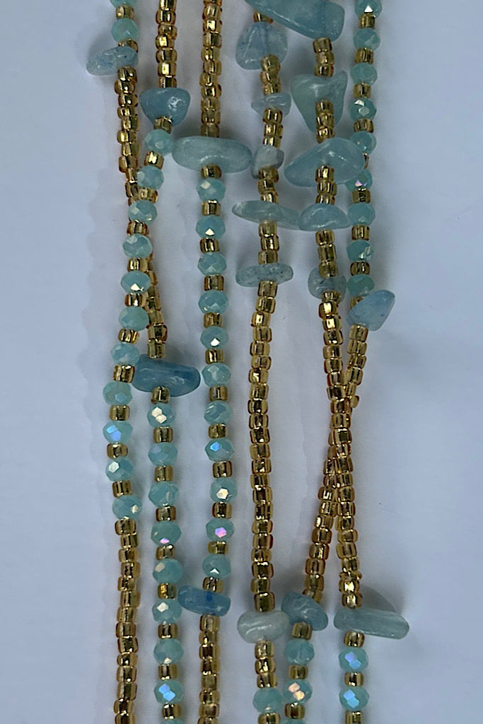 Wrap yourself in serenity with our Aquamarine Gemstone Waist Bead — a symbol of calm, courage, and emotional clarity. Handcrafted in Ghana, each strand features luminous aquamarine stones known for soothing the soul, reducing stress, and inspiring clear communication. Perfect for setting intentions around peace, self-expression, and flow.